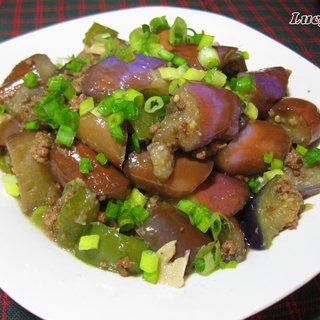 原料:茄子、青椒、蒜片、姜末、葱花、牛肉末。