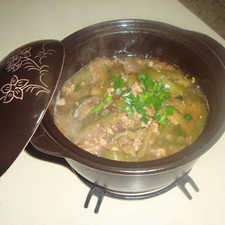 原料:青茄子、肉末、蒜头、菜脯末、豆瓣酱、葱末。