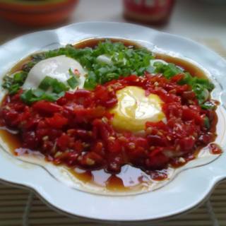 原料:鸡蛋、红剁椒、葱花、蒸鱼豉油。