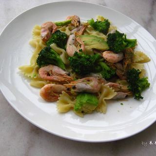 原料:瓦索农场蝴蝶通心粉、加拿大野生北极虾、牛油果、花椰菜。
