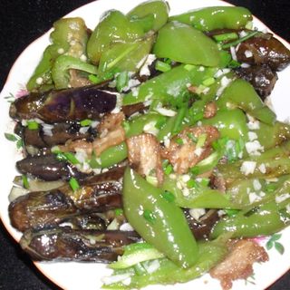 原料:小茄子、辣椒、五花肉、油、盐、酱油、鸡精、蒜、小葱。