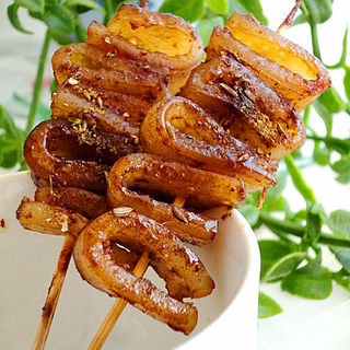 原料:猪皮、葱、姜、蒜、料酒、花椒、烤肉料、孜然粉、孜然粒、花椒粉、盐。