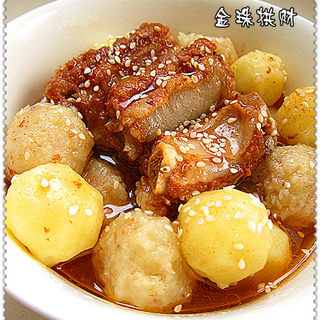 原料:排骨、土豆、香菇、姜、油、盐、大喜大香辣烤肉酱。
