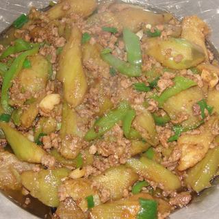 原料:茄子、肉末、青椒、料酒、糖、生抽、淀粉、葱花、蒜末。