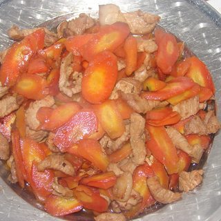原料:猪瘦肉、胡萝卜、料酒、生抽、盐、味精。