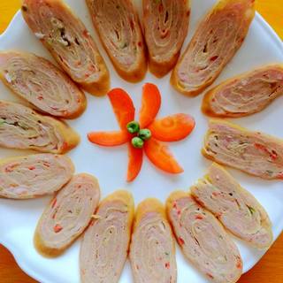原料:猪肉馅、干豆腐、胡萝卜、葱、姜、胡椒粉、鸡精、鸡蛋、淀粉、盐。