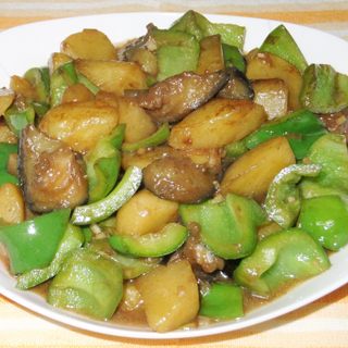 原料:土豆、茄子、青椒、姜末、葱末、蒜末、老抽、蒸鱼豉油、盐、糖、水淀粉、鸡精、冰糖、料酒、蚝油。