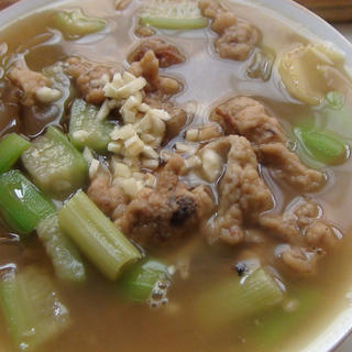 原料:丝瓜、炸鸡块、粉皮、味极鲜酱油、葱、姜、蒜、香油。