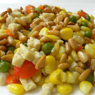 原料:天贝、甜玉米、豌豆、松仁、红椒、糖、盐、胡椒粉、淀粉、油。