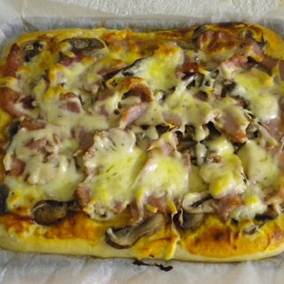 原料:高粉、盐 、糖、酵母、黄油、口蘑、培根、马苏里拉奶酪、番茄酱。