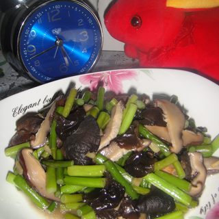 原料:新鲜蒜薹、干香菇、干木耳、姜、油、盐 。