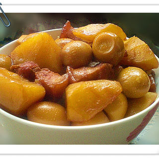原料:五花肉、鹌鹑蛋、土豆、料酒、食盐、八角、桂皮、香、姜丝。