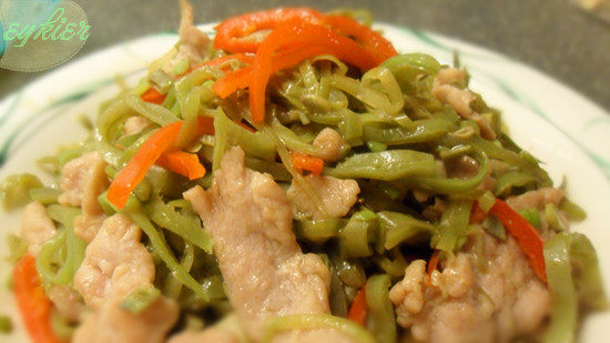 原料:宽扁豆、猪里脊肉、红椒、蒜、料酒、十三香、玉米生粉、盐、蚝油。