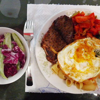 原料:牛排、西红柿、洋葱、木耳菜、红甜椒、紫甘蓝、黄瓜、意大利空心粉、红酒、柠檬、鸡蛋、蒜、葱。