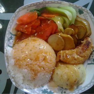 原料:上海青、杏鲍菇、土豆、胡萝卜、鸡脯肉、腌料、番茄酱、盐、太太乐鸡汁。