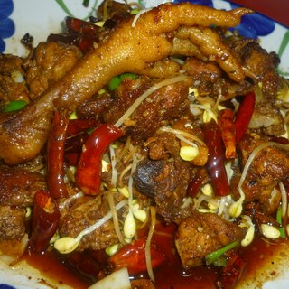 原料:土鸡、黄豆芽、干红辣椒、蒜瓣、姜、八角、花椒、葱、盐、味精、五香粉、酱油、醋。