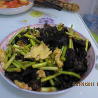 原料:蒜薹、木耳、鸡蛋、葱 姜 蒜。