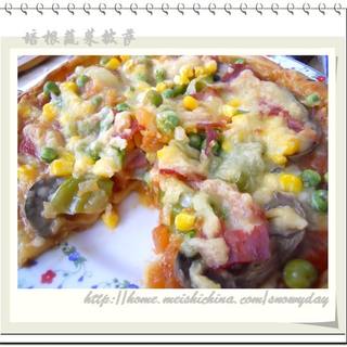 原料:面粉、口蘑、青椒、玉米、青豆、番茄、洋葱、牛奶、黄油、培根、马苏里拉芝士、黑胡椒、盐、砂糖。