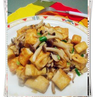 原料:蟹味菇、卤水豆腐、姜、香葱、花生油、盐、生抽。