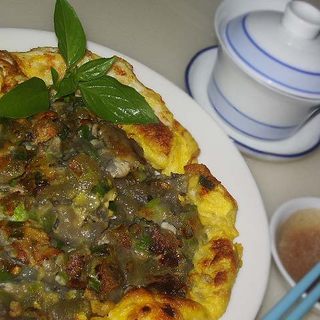 原料:蚝仔、地瓜粉、鸡蛋、香菜、葱。