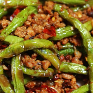 原料:四季豆、猪肉、蒜末、姜末、干辣椒、白芝麻、水、花椒、黑色豆瓣酱、黄酒、芝麻油、砂糖、豉油。