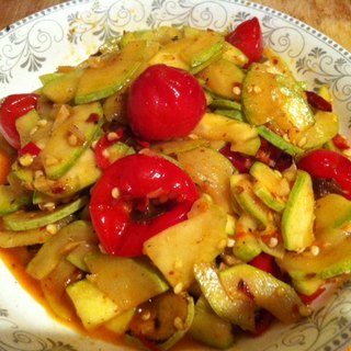 原料:西葫芦、泡灯笼椒、葱、姜、蒜、干辣椒、鲜红椒、红椒粉、泡椒汁。