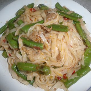 原料:豆角、面条、油、炒羊肉、豆瓣辣酱、盐、香油、青辣椒。