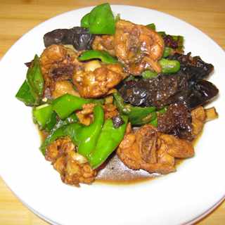 原料:青椒、木耳、鸡、葱、大料、姜。