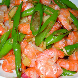 原料:去头虾仁、小尖椒、盐、鸡精、姜蒜末。