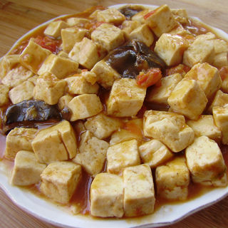 原料:豆腐、西红柿、香菇、大豆油、精盐、五香粉、味精、郫县豆瓣酱、葱末、姜末。
