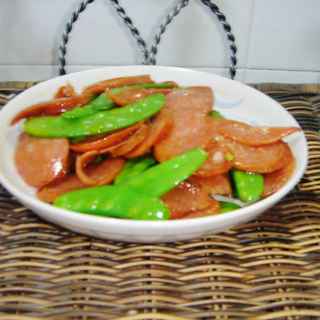 原料:香肠、红椒、青椒、食用油、生抽、鸡精、香醋、胡椒粉。