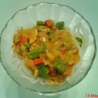 原料:桂林米粉、红咖喱粉、椰粉、小马铃薯、洋葱、青椒、胡萝卜、鸡肉、牛奶。