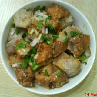 原料:排骨、香芋、盐、酱油、糖、黄酒、生粉、蒜茸、葱、老干妈辣椒酱。