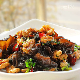 原料:核桃仁、黑木耳、葱、香菜、辣椒、油、盐、酱油、鸡精。
