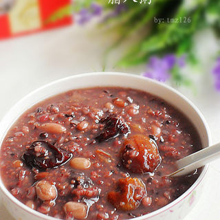 原料:大米、小米、黑米、红豆、豇豆、薏米、麦仁、花生米、红枣、蜜枣、葡萄干、冰糖。