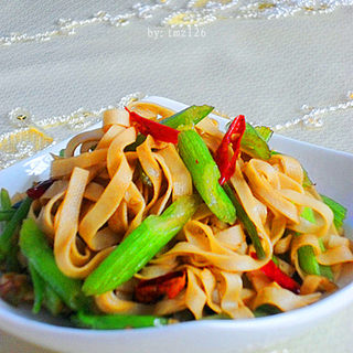 原料:西芹、豆腐皮、葱、辣椒、油、盐、生抽、鸡精。