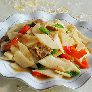 原料:山药、猪肉、青椒、红椒、葱、油、盐、料酒、淀粉、生抽、鸡精。