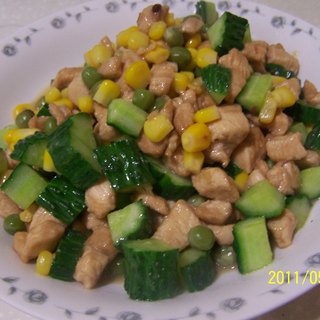 原料:青豆、玉米、黄瓜、鸡脯肉、黄豆酱、盐、生抽。