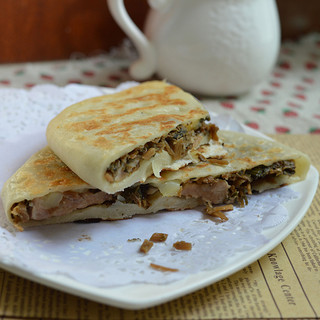 原料:面粉、开水、梅干菜、土豆、瘦肉、生粉、生抽、盐、糖、油。