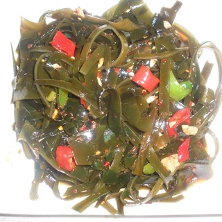 原料:新鲜海带、糖、生姜、蒜头、醋、酱油、辣椒。