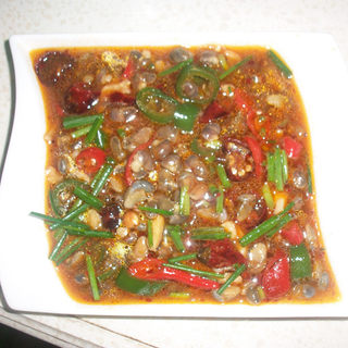 原料:麦螺、蒜、蒜、生姜、红椒、蒜头、青椒、叉烧酱、盐、酱油、鸡精、辣椒。