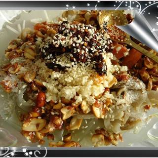 原料:黄瓜、红薯粉条、蘑菇、花生、豆芽、辣酱、糖、芝麻。