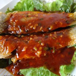 原料:小黄鱼、番茄酱、蒜沫、葱沫。