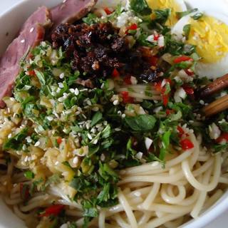 原料:拉面、干切牛肉、熟鸡蛋、蒜末、榨菜末、香椿末、老干妈辣椒酱、白芝麻。