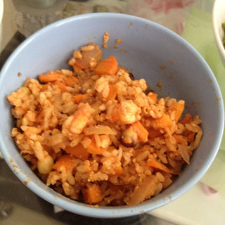 原料:鲜虾、米饭、鸡蛋、胡萝卜、洋葱、玉米粒、盐、胡椒粉、番茄酱、蒜蓉辣酱。