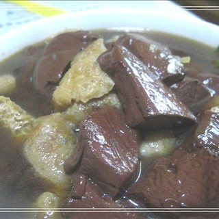 原料:猪红、油豆腐、青椒、水、姜、盐、鸡精。