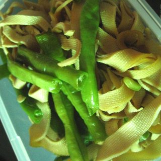 原料:豆角、豆腐皮、辣椒、蒜、油、酱油、盐。