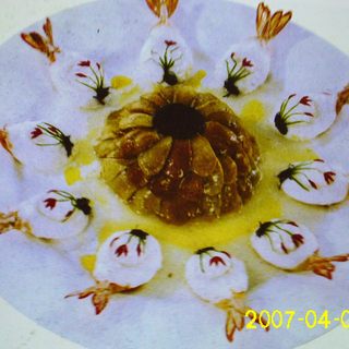 原料:鲍鱼、虾茸、熟鸡脯、熟鸽蛋、对虾、冬菇、冬笋、葱、姜、料酒、盐、味精。