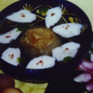 原料:海蛰头、蛋清、熟火腿末、菠菜叶、盐、味精、鸡清汤。