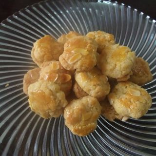 原料:普通面粉、杏仁、白糖、植物油、鸡蛋、泡打粉、小苏打。